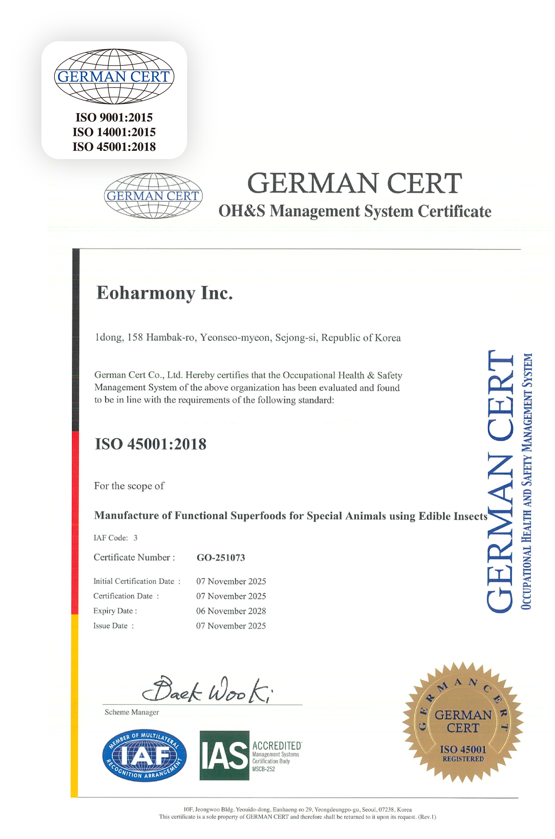 We have verified that the audit standards and certification scope meet all the requirements of the Occupational Health and Safety Management System below and have approved the certification